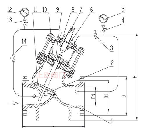 由主閥和外控組件組成,主閥由閥體、閥板、閥蓋、閥座及活塞、活塞缸等構(gòu)成。外控組件由過濾器、調(diào)節(jié)閥控制閥等組成。當(dāng)下游流量低于設(shè)定流量時(shí),與主閥出口處相連的控制閥開啟,主閥控制室的壓力水經(jīng)過濾器、調(diào)節(jié)閥、控制閥流入主閥的出口,主閥板升高增大流量。當(dāng)主閥出口流量高于設(shè)定值時(shí),控制閥關(guān)閉。主閥進(jìn)口端的一部分壓力溫水經(jīng)調(diào)節(jié)閥、過濾器進(jìn)入主閥控制室,引起控制室壓力增高主閥板下降,減少主閥下游流量。調(diào)節(jié)控制閥可以調(diào)節(jié)主閥下游的流量。